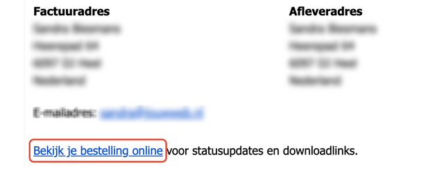 Wanneer er op de link "Bekijk je bestelling online" wordt geklikt, staat bij het product/patroon een "Download nu" link.